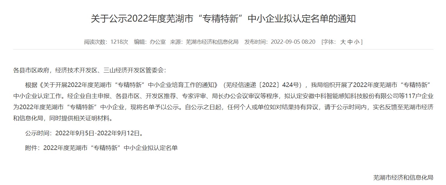 9月5日,芜湖市经信局公布了 2022年度芜湖市“专精特新”中小企业认定名单,经过7天的公示期,安徽金年会信息技术有限公司等117家企业被认定为2022年度芜湖市“专精特新”中小企业。