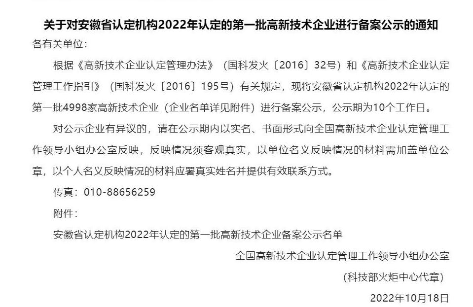 10月18日,安徽省认定机构对2022年认定的第一批高新技术企业进行了备案公示。安徽金年会信息继2016年,2019年,第三次被认定为