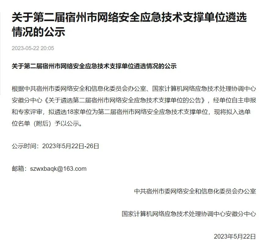 ? ? ? ? ?近日,中国宿州市网络安全和信息化委员会办公室、国家计算机网络应急技术处理协调中心安徽分中心发布了第二届宿州市网络安全应急技术支撑单位遴选情况,安徽金年会成功入选。