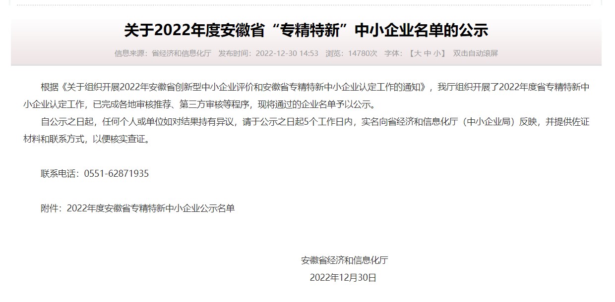 ? ? ? ? ?近日,安徽省经信厅公布了2022年安徽省“专精特新”中小企业名单。安徽金年会成功通过审核,被认定为安徽省“专精特新”中小企业!